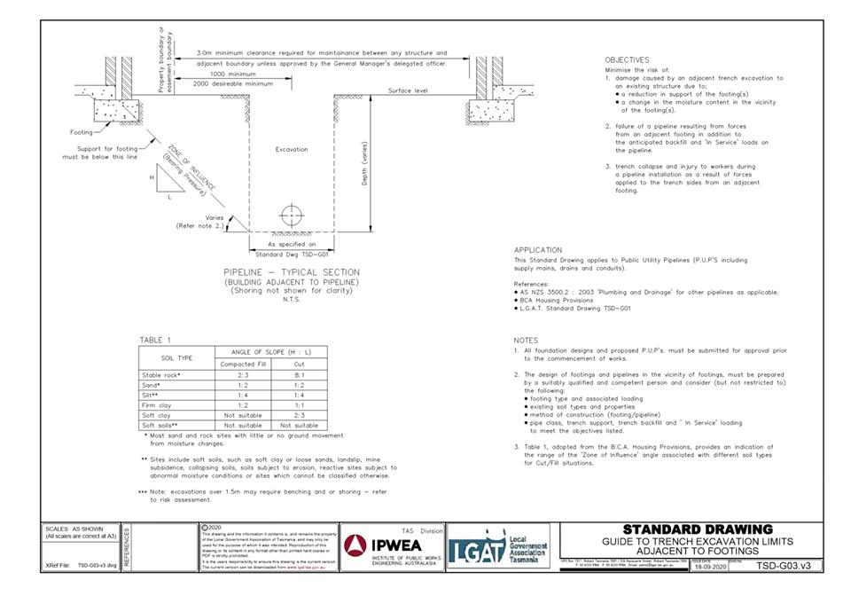 2. The size and design of the connection such that it is appropriate to safely service the development; 3. Clearances from any nearby obstacles (e.g. services, crossovers, trees, poles, walls); 4. Long-sections of the proposed connection clearly showing cover, size, grade, material and delineation of public and private infrastructure; 5. Connections which are free-flowing gravity driven; and 6. Be in general accordance with Council's departures from the LGAT Tasmanian Standard Drawings, available from our website. All work required by this condition must be undertaken in accordance with the approved detailed engineering drawings.